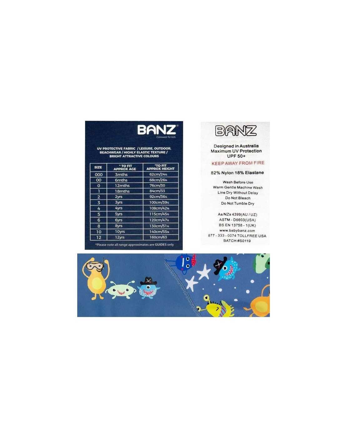 - UPF 50+ - Toate costumele de baie Banz® pentru copii au fost testate clinic la o evaluare de UPF 50+